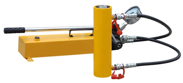 8、使用時(shí)先將手動(dòng)泵的快速接頭與頂對接,然后選好位置,將油泵上的放油螺釘旋緊,即可工作。欲使活塞桿下降,將手動(dòng)油泵手輪按逆時(shí)針?lè )较蛭⑽⑿?,油缸卸荷,活塞桿即逐漸下降。否則下降速度過(guò)快將產(chǎn)生危險。